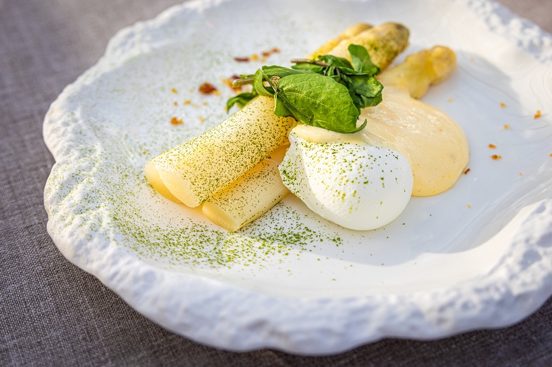 Gastronomische beleving van wijn-spijs met asperges in de polder.